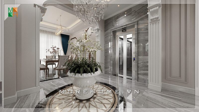 Đá lát nền nhà phần hành lang rộng với hoa văn sang trọng, tinh tế.