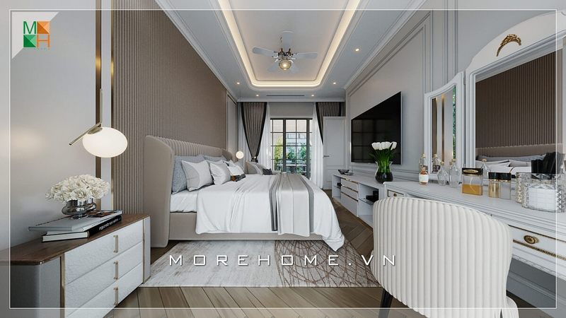Phòng ngủ được thiết kế với tone chủ đạo là sắc trắng hiện đại và bố trí nội thất cao cấp gây ấn tượng mạnh trong ngôi nhà phố