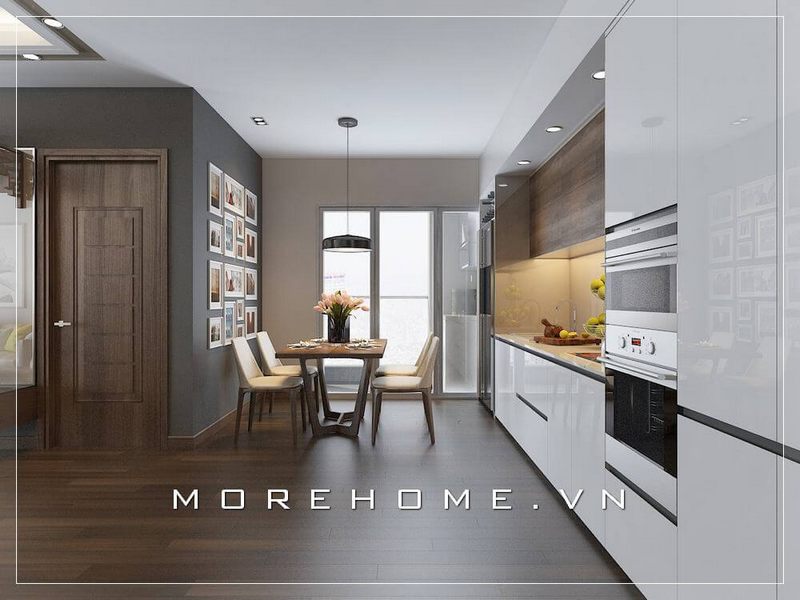 Mẫu tủ bếp gỗ công nghiệp màu trắng hiện đại cho phòng bếp chung cư