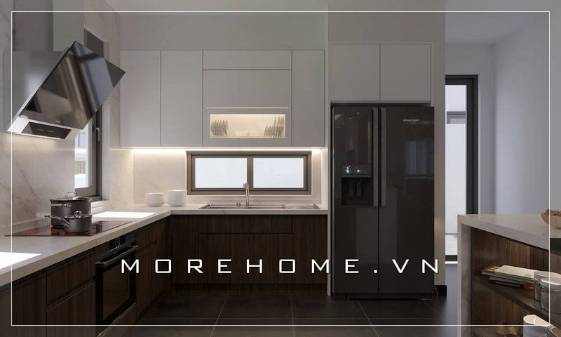 Mẫu tủ bếp gỗ công nghiệp chữ L kết hợp thiết bị phòng bếp hiện đại tạo nên ăn bếp tiện nghi cho người nội trợ