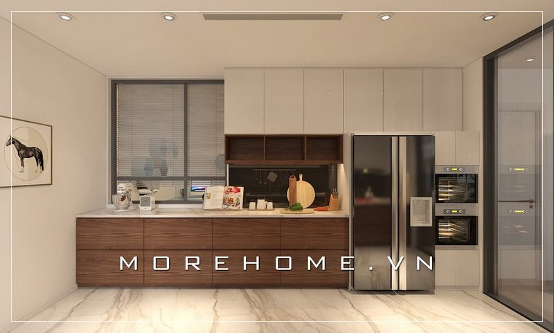 Phòng bếp đa năng với hệ tủ gỗ tự nhiên màu nâu đậm và tủ gỗ công nghiệp màu trắng thiết kế hiện đại, phù hợp không gian