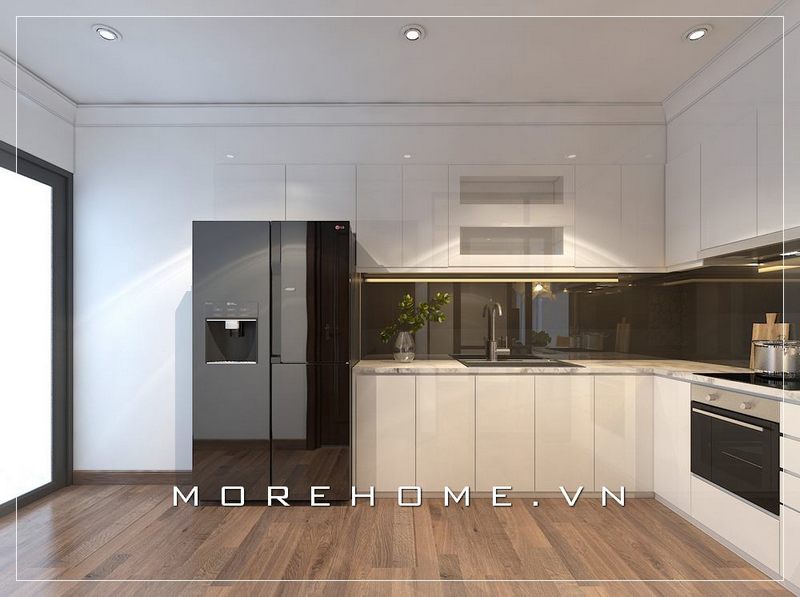 Mẫu tủ bếp gỗ acrylic chữ L màu trắng hiện đại cho căn bếp chung cư