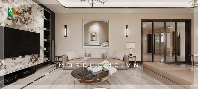 Bàn trà phòng khách biệt thự được đặt ở vị trí trung tâm của căn phòng giúp không gian trở nên sang trọng, lịch sự hơn.