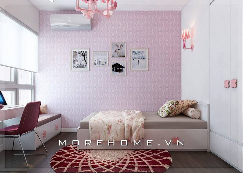 Một không gian xinh xắn dành cho bé gái với giấy dán tường màu hồng.