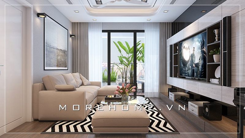 Mẫu thiết kế phòng khách chung cư giúp tạo ra không gian sống thoải mái và tiện nghi.
