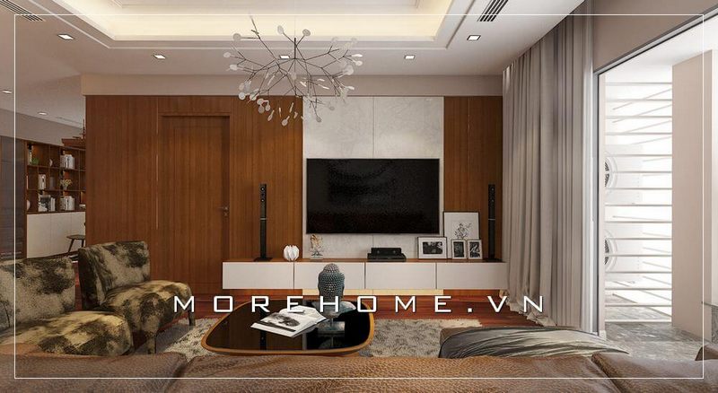 Gam màu trầm đóng vai trò chủ đạo, khiến nội thất phòng khách của chung cư góp phần tạo nên một không gian ấm cúng và thân thiện hơn cho gia chủ.