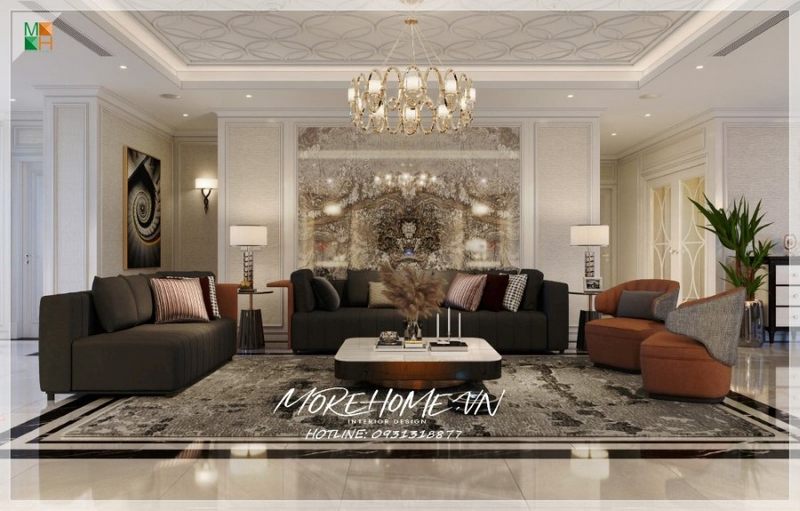 Phong cách tân cổ điển đang là xu hướng thịnh hành trong những năm gần đây và được áp dụng trong thiết kế phòng khách biệt thự.