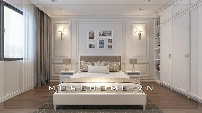 Mẫu giường ngủ chung cư màu trắng được thiết kế theo phong cách hiện đại, trẻ trung và không kém phần sang trọng