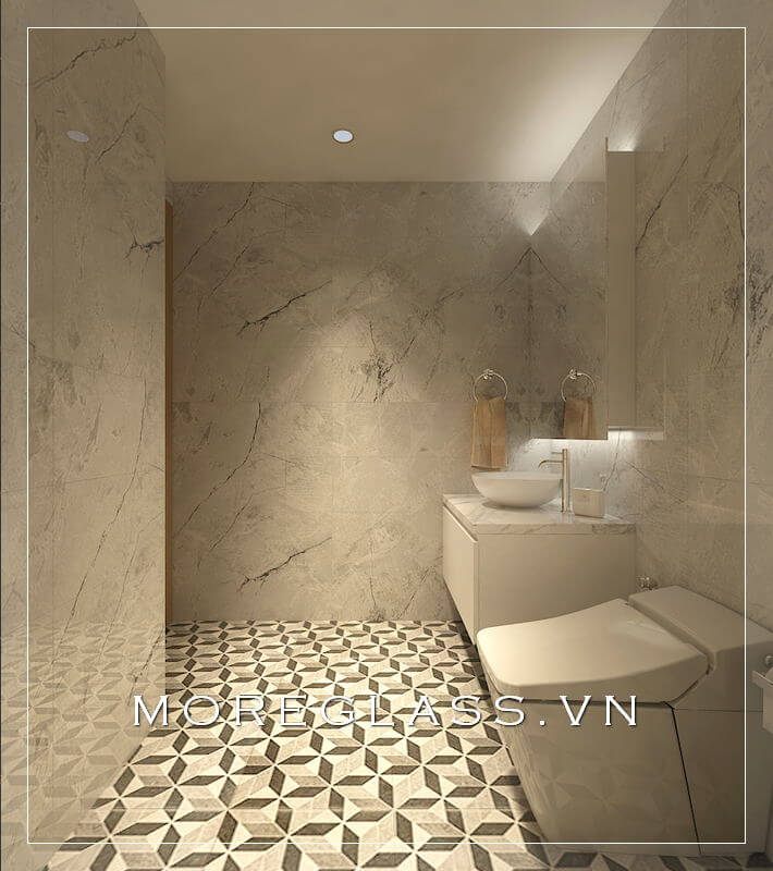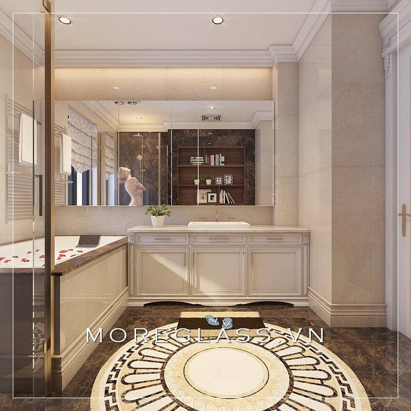 . Lấy gạch lát nền hoa văn độc đáo làm nền, kết hợp với đá ốp tường phòng tắm màu vàng sáng và bức gương kính lớn, tạo nên không gian phòng tắm rộng rãi, sang trọng.