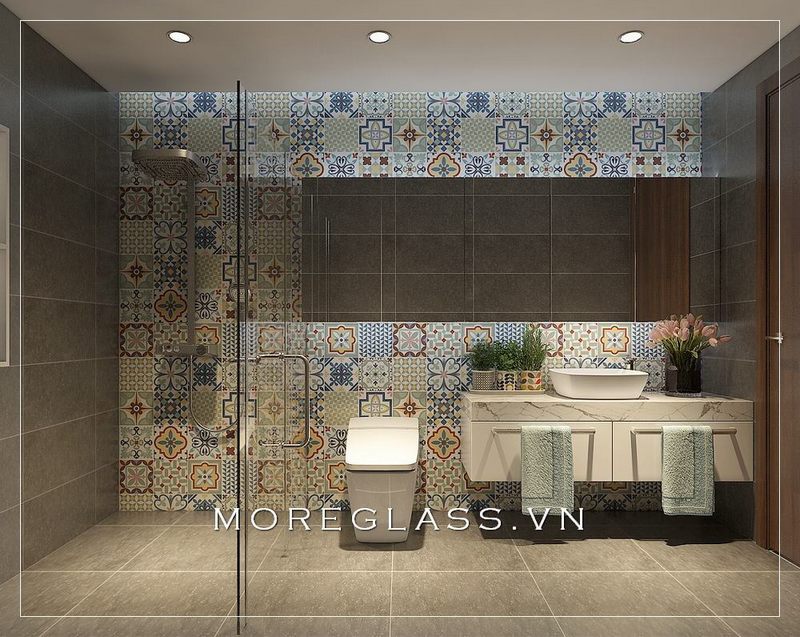 . Phòng tắm được trang trí đẹp bằng nội thất và thiết bị vệ sinh đơn giản, tiện nghi, với tông màu gạch ốp sáng tạo nên sự thoáng đãng cho căn phòng.